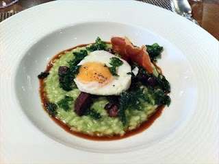 The ox tongue surprises as crisp nuggets hiding in a pale green garlic and parsley risotto.