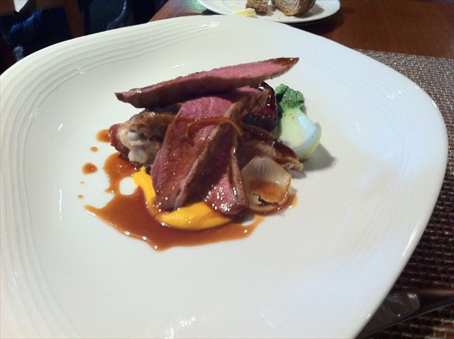The other main course at our table is slices of duck, which are pink as a lolling tongue. The sweet meat is paired with beetroot, carrot and a sticky orange sauce. Jutting out the side, like a lost child is a lone slice of Chinese green.