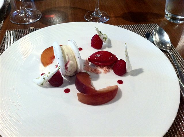 Lastly it’s a raspberry vacherin with vanilla ice cream, poached peaches and Perthshire raspberries. The ice cream is sandwiched like a yoyo between two discs of meringue. It’s a sweet play on peach melba and as pretty as a picture.