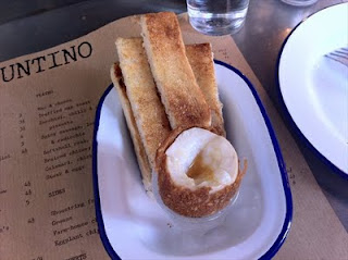 Exhibit b) Egg and soldiers (£3.5) A googy egg, niftily given a shell of spices and seeds, with stout fingers of buttered toast.