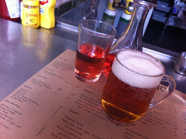 The drinks list is taut, but solid. Meantime Pale Ale is served at £2.50 for a half pint. The other option is Moretti. There’s a short selection of wine by the glass and carafe and an impressively stocked bar, with suggestions of cocktails that pack a punch. Negroni anyone?