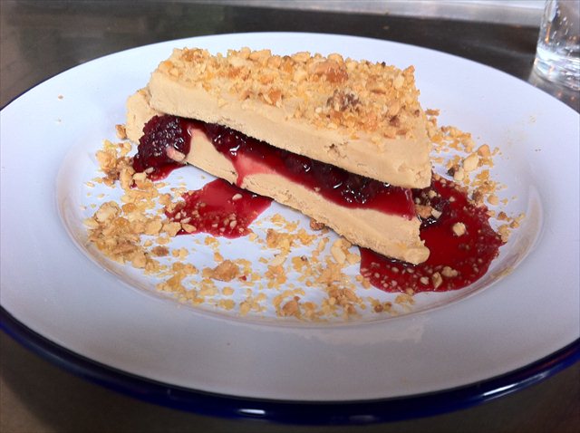 Desserts are a highlight, particularly their twist on the peanut butter and jelly sandwich. It’s two slices of peanut parfait, layered with a rustic raspberry jam.