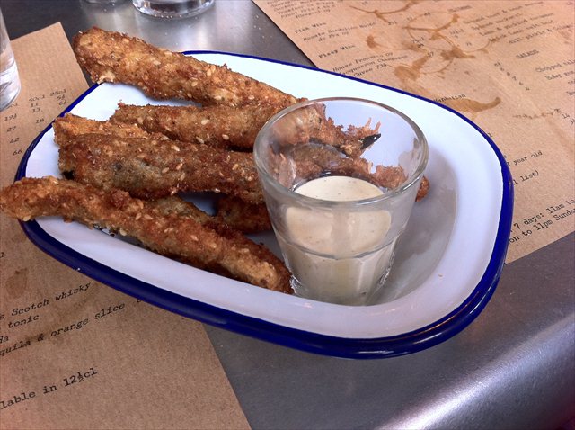 And then there’s a few more international small plates, like eggplant chips, crusted with fennel and caraway with a fennel seed yogurt dip, or a prosaic beetroot, ricotta and rocket salad, with green leaves poking out like wares at a messy garage sale.