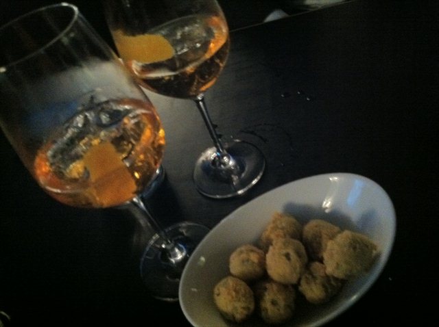 Crumbed olives stuffed with confit garlic and a Spritz at Berta