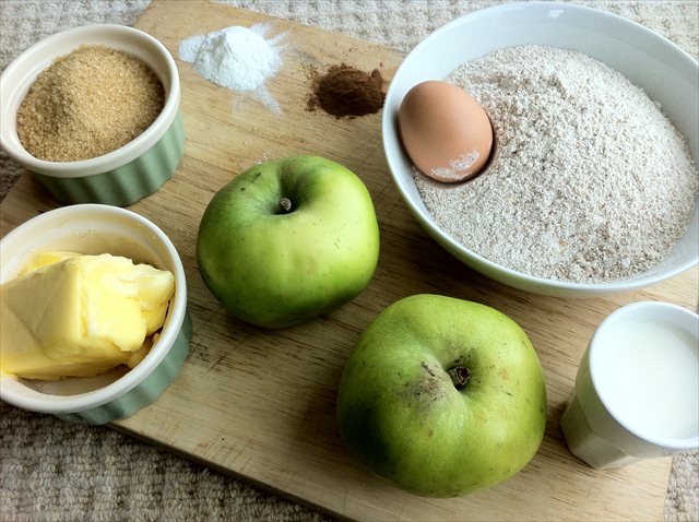4. Stir 115g of the sugar, three quarters of the apple and the egg into the flour and butter mixture. Mix well, adding a little of the milk at a time to make a soft doughy mix.