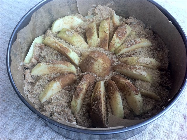 6. Decorate the top of the cake with the remaining pieces of apple. Sprinkle the top of them with the remaining sugar and cinnamon.