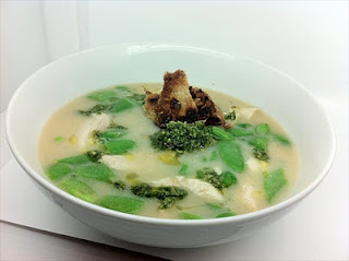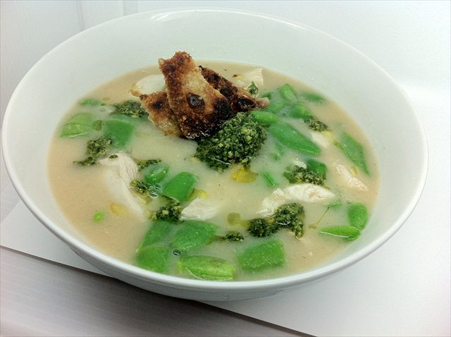 6) Serve the soup in bowls with a teaspoon of pesto in the centre and the chicken skin croutons.