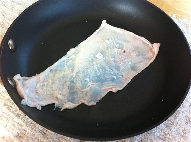 4) Start making your chicken skin croutons. Dry the skin with paper towel and then stretch it out in a frypan. Sprinkle with salt.