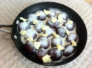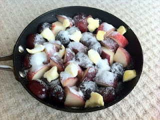 3) Slice the fruit into half moons or chunks if they’re large peaches or nectarines. Place in the non stick fry pan and dot with butter and scatter half the sugar over the top. Bake for 10 minutes.