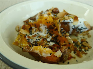 After that, all they need is something to play against the mushy sweetness. A slick of yogurt (sheep yogurt would be best, but any good natural yogurt is fine). Some toasted nuts and seeds for crunch- I like a combination of black sesame seeds, flaked almonds, sunflower seeds and hazelnuts. And then a gilding of browned butter.