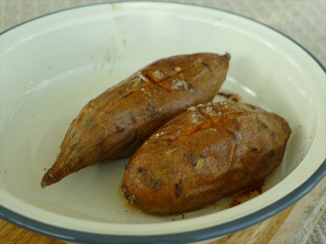 2. Make a cross with a knife in the top of the two sweet potatoes. Drizzle with olive oil and sprinkle with salt.