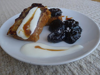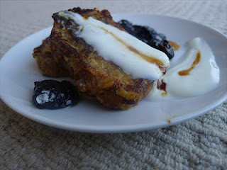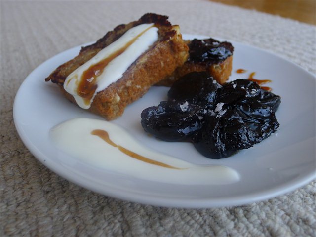 4. Serve the warm french toast with a dollop of natural yogurt, the prunes, sauce and a small sprinkling of sea salt for kick.