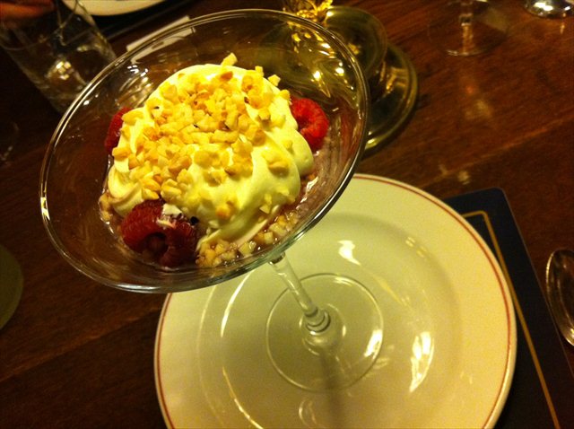 Dessert is a raspberry syllabub trifle. Trifle conveys the layered construction; not the size of the portion. This syllabub- an English classic that dates to Tudor times- is less curdled cream and more of a cream cheese consistency. It’s sweetly rich and a few of us fail to find our way to the bottom (though The Hungry One lives up to his moniker).