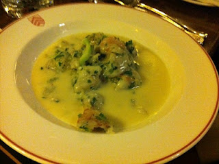 Dinner commences with fish soup- a ballast of cream and fish stock, deckled with shellfish and parsley.