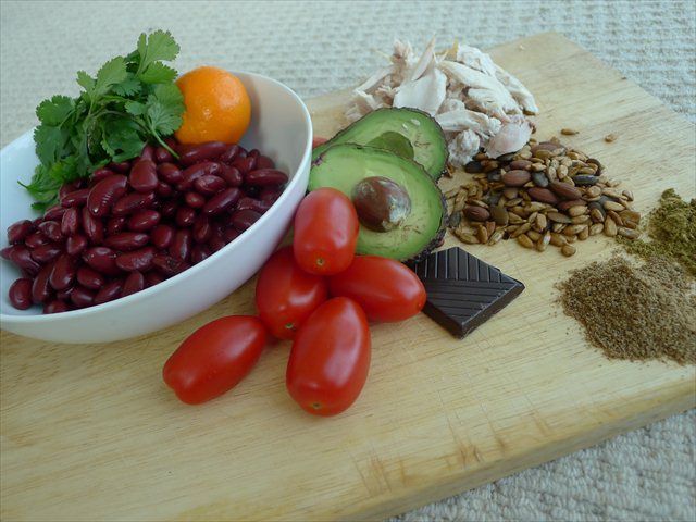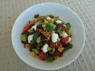4. Assemble the salad by combining the bean/chicken/tomato mixture with the chopped avocado, coriander leaves, remainder of the chopped tomato and about half of the mandarin segments, cut into thirds.
