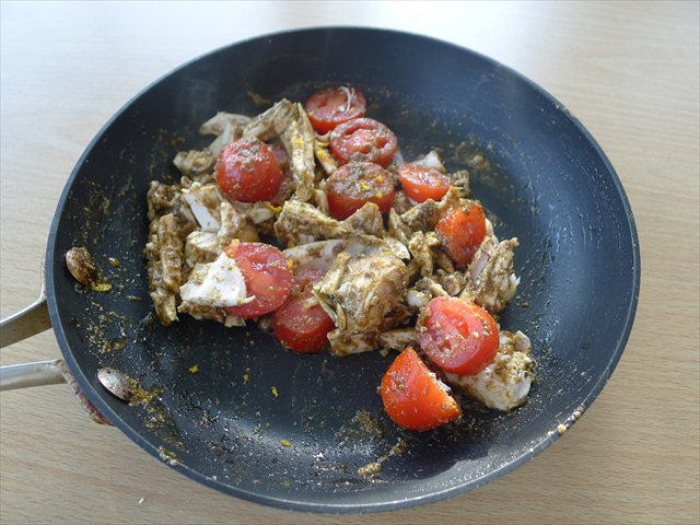 2. Add the shredded chicken and 3/4 of the tomatoes. Cook until the chicken is warmed through and the tomatoes have softened.