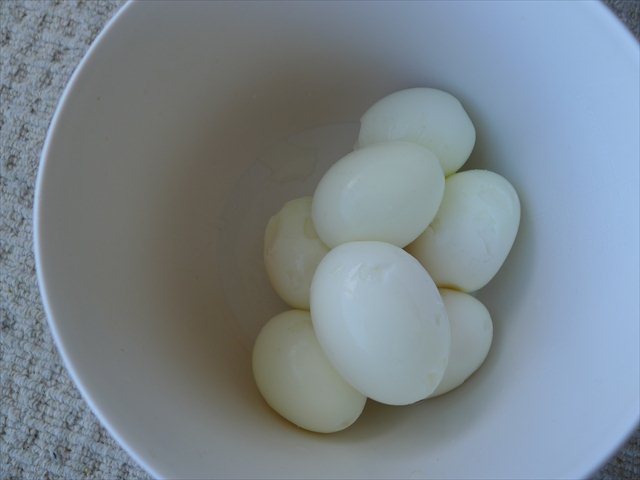 3. Once the eggs are cool enough to handle, very very carefully remove the shells by tapping the top and the bottom against a hard surface. It helps to do it under a gentle stream of running water. Don’t break the yolk.