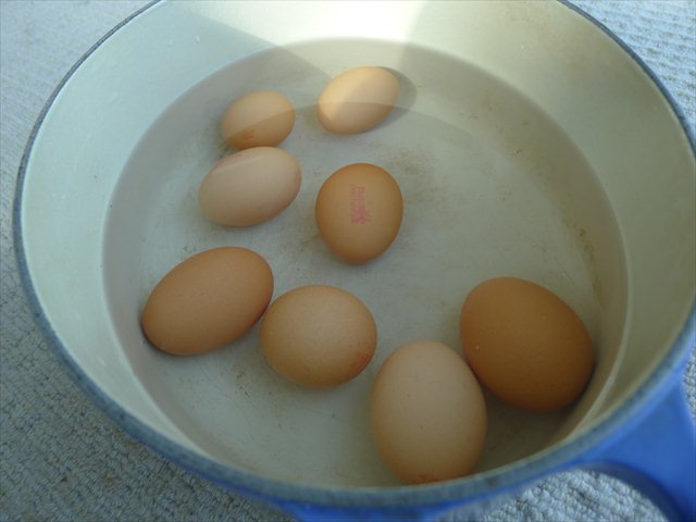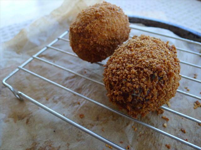 8. Heat enough oil to cover the eggs in a saucepan (or in a deep fryer) to 190 C/ 375F. Fry two eggs at a time for two minutes.
