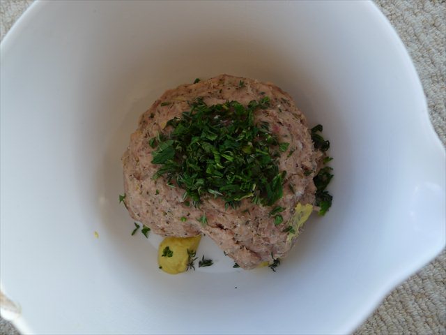 2. In a bowl combine the minced chicken, thyme, mint, mustard and 2 tablespoons of water.