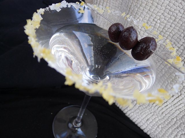 On to the contents; there’s a depressive wallop of gin; just the thing for when the pace of change makes you want to wallow in a corner. There’s a whisper of French in the Cointreau that washes the glass. There’s the sting of salt; care of the olives and the flakes on the rim.
