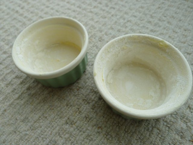 2. Grease two holes in a muffin tin or two 1 cup ramekins. Then roll a teaspoon of plain flour over the inside and tap out excess.