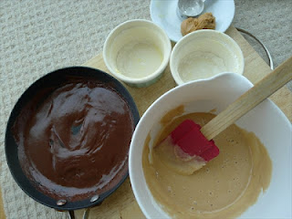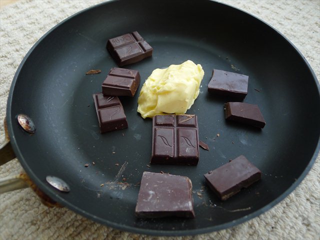3. Place 25 grams of the butter and the chocolate in a pan and melt the two of them over a medium heat.