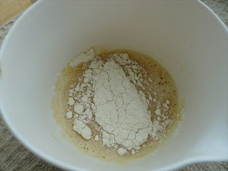 6. Add the sugar and whisk together. Then stir in the vanilla essence and the plain flour.