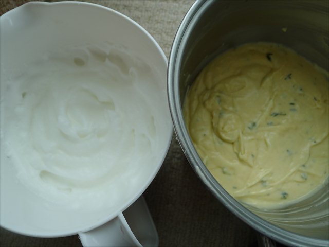 6. Whisk the egg whites with a pinch of salt until stiff. Fold in a tablespoon of the egg whites into the cheese mix to lighten it, and then carefully fold the rest of the egg whites.
