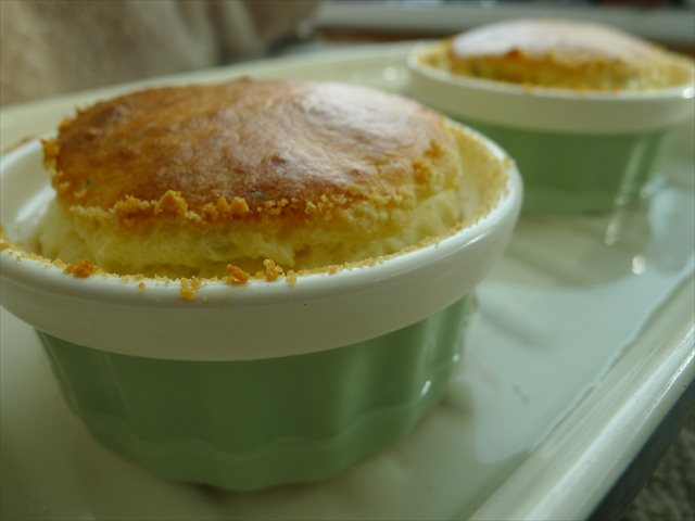 9. Leave to cool (and sink) and then carefully loosen with a sharp knife. Turn out the soufflés and transfer to individual heat proof dishes.