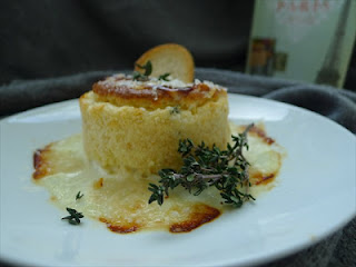 10. When you are ready to serve preheat the oven to 200C/ 390 F, pour some cream over each soufflé and sprinkle on the Gruyère/ parmesan. Bake for 10-15 minutes or until well-risen and golden. Serve immediately with baguette spears.