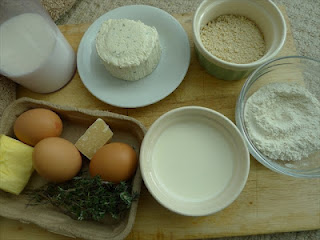 5. Beat in the egg yolks, thyme and 125g Boursin/(or soft goat cheese).