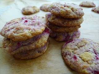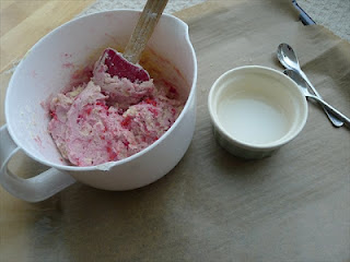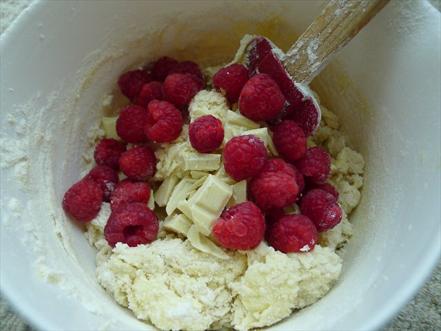 3. Sift in the flour, salt drop in the raspberries and chocolate chunks and work it into a soft dough- the raspberries will ripple through the dough.