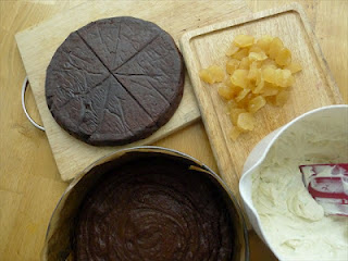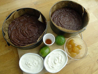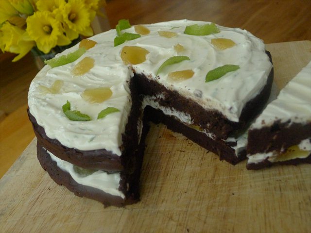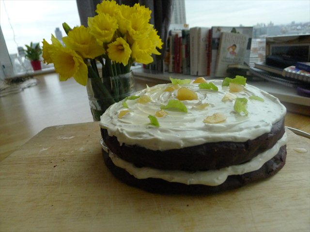 3) Sandwich the other cake over the top. Spread the remaining frosting on and scatter some curls of lime zest, remaining ginger segments over the top.