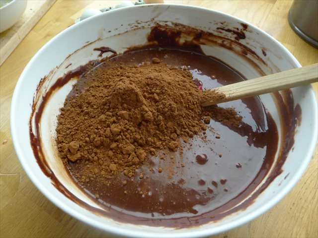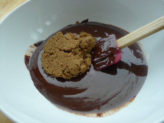 4) Transfer the butter and chocolate to a mixing bowl and add the sugar.