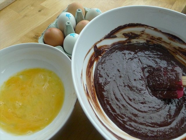 5) Add the beaten eggs one at a time, stirring well between each addition.