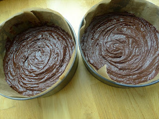 8) Pour half into each cake tin. Bake for 20-25 minutes, until a skewer comes out clean. You don’t want to over bake the cakes as it will become dry. A little fudgy is good.