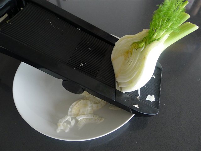 1/2 fennel, finely shaved on a mandolin, wafty dill like fennel tops reserved