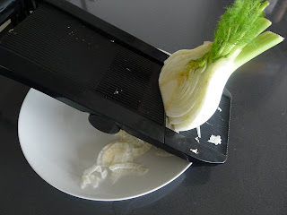 It also gives me an excuse to pull out the mandolin, my latest indulgence of kitchen tech for a very small London kitchen. The beauty of a mandolin isn’t just about playing Russian roulette with your finger tips (CAREFUL)- it’s how easily creates anorexic thin waftings of vegetables for salads. When it comes to fennel, this is a good thing. I know not everyone is as much of a fan of the white bulb as I am. (The Hungry One loves to tell a story about how a few years ago when I was a little stressed and strung out he came downstairs to find me sitting in the glow of the open fridge door, gnawing on a fennel bulb like an apple.) That’s obviously not for everyone. By shaving it this thinly fennel becomes more about texture and freshness rather than a grating aniseed twang.