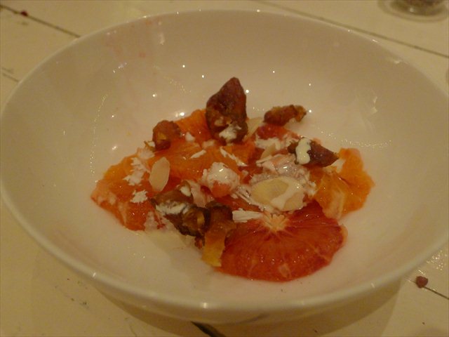 Dessert was artfully simple bowls of sliced blood orange, toasted almonds, dates and a drizzle of creme fraiche. It’s elegantly simple and light, a riot of colour in a white bowl.