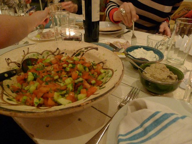 Main course are lamb kebabs, with warm pitas passed around with soft slices of pink lamb that’s been cooked on a rotisserie in the oven in the corner of the impressively kitted domestic kitchen.