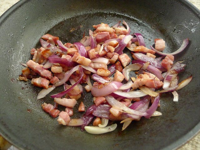 3. Place the pan over a medium heat and add the lardons/bacon and fry until the fat has begun to render. Add the half moons of red onion and cook for 10 minutes until the onions are softened.