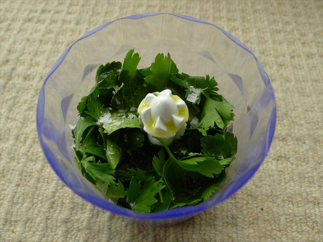 1. To make the dressing add the clean and picked parsley leaves into a small blender with a pinch of salt.