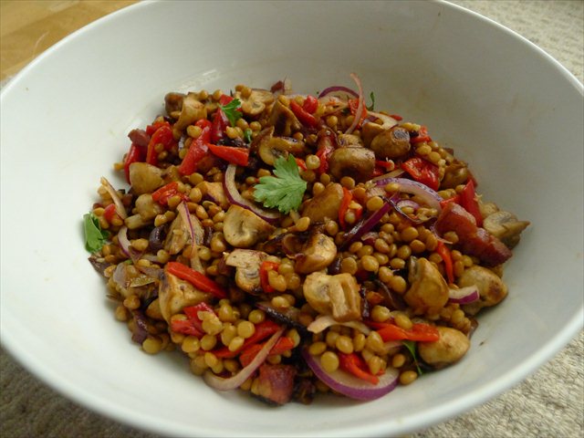 5. Combine the rinsed lentils with the onions, lardons and mushrooms. Add the sliced marinated peppers and stir to meld.
