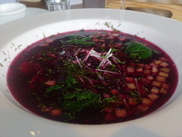 Good options on the menu are Russian, like the cold version of borscht; trillingly light beetroot juice bulked out with shredded radish, dill and cubes of cucumber. After two days of eating pies and pelmeni, your body will thank you.