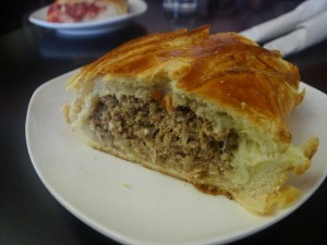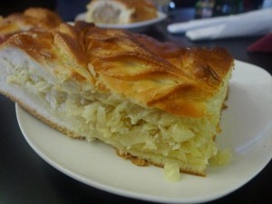 Stolle are casual places, where you order at the counter and then try and find yourself a seat in the adjoining dining room. There’s tea, soft drinks and not-so-impressive looking coffee. At lunch, there’s beer (but no wine). What they specialise in are kulebjaka; pies made from yeasted dough cleaved into rectangle slices. They sit somewhere somewhere between a large sausage roll, a panini and a pie.
