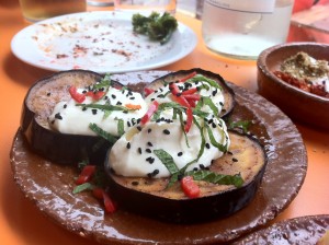 4) Fried aubergine with chilli, mint and labne.