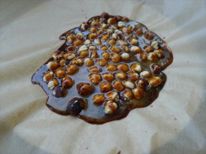 2) Place the roasted, skinned hazelnuts on a plate lined with baking parchment (the easiest way to rub the skins off the hazelnuts is to place them in a clean tea towel or on paper towel and rub until the skins shirk away). Pour the liquid toffee over the top of the hazelnuts. Set aside to solidify and cool.