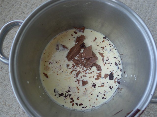 5) To make the rest of the filling place the cream in a saucepan and bring to a simmer. Add the chocolate and stir until melted and combined.