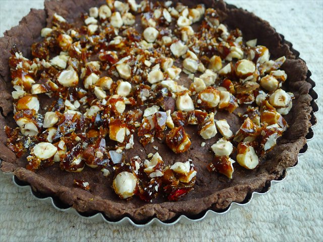 4) Place 3/4 of the praline pieces on the bottom of the cooked tart shell.