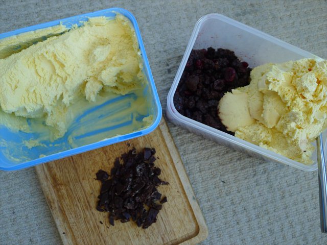 3) To make the ice cream transfer the vanilla ice cream to a larger tupperware. Crumble in the brownies then fold in the cherries, any remaining brandy that’s pooling in the bottom and the shards of popping candy chocolate.